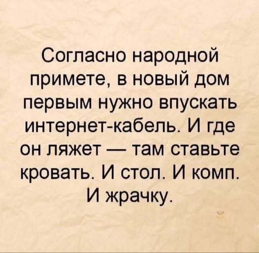 Согласно народной примете, в новый дом первым нужно впускать интернет-кабель. И где он ляжет — там ставьте кровать. И стол. И комп. И жрачку.