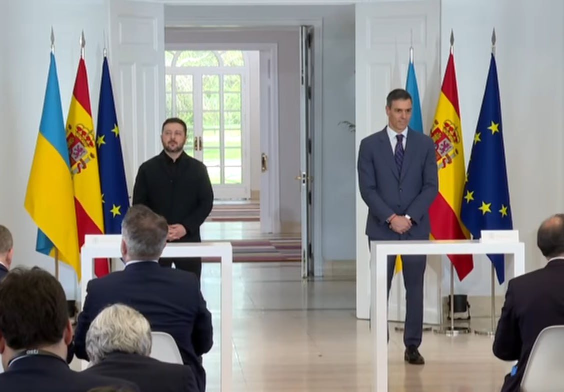 зелёный клоун уже не рассчитывает на помощь сша. Начал европейские попрошайнические гастроли с Испании, чем явно разозлил Трампа, который насаживает на кукан европоцов, и Испания одна из первых в этом списке после известных событий.))
