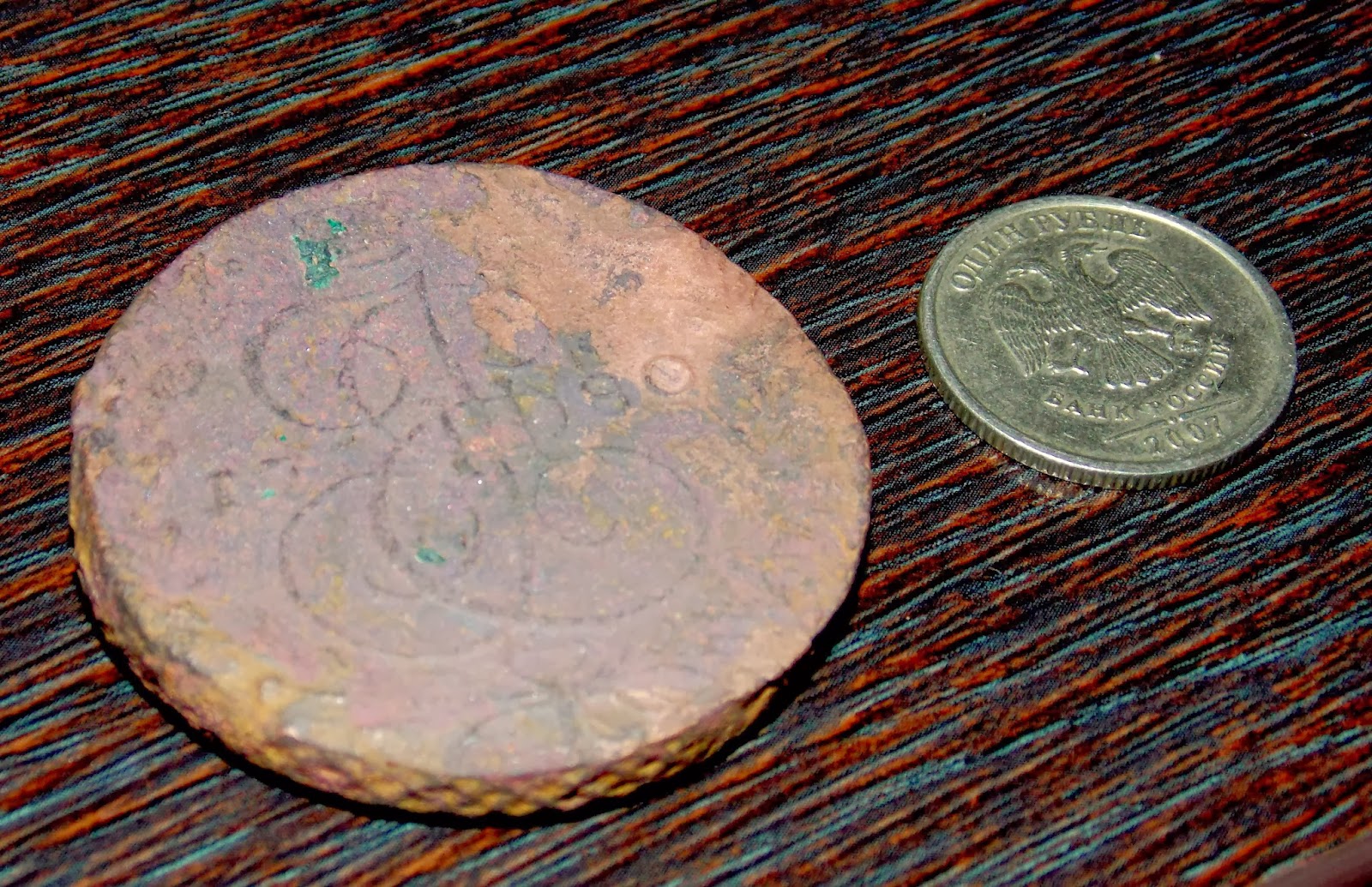 Через пару дней, после очистки, я обнаружил, что это - 5 копеек 1780 года. По каталогу Биткина считается редкостью. Выпускалась во времена Екатерины II тиражом 51 миллион штук. Сохранилась монета так себе, но определить её номинал и год удалось.