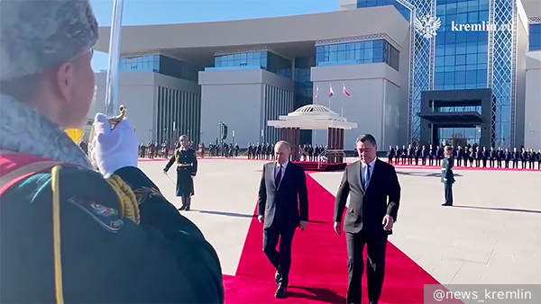 На территорию резиденции Путин подъехал на «Аурусе», в сопровождении кавалерийского эскорта. У входа в комплекс его ждал Жапаров, который тепло поприветствовал российского лидера.