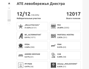 Оппозиционный Патриотический блок в Приднестровье получил 51,02% голосов на выборах в парламент Молдавии после подсчета 100% протоколов. У правящей партии