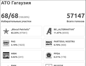 По итогам обработки 100% протоколов в Гагаузской автономии, Патриотический блок набрал 82,35% голосов на парламентских выборах в Молдавии, сообщил ЦИК страны.